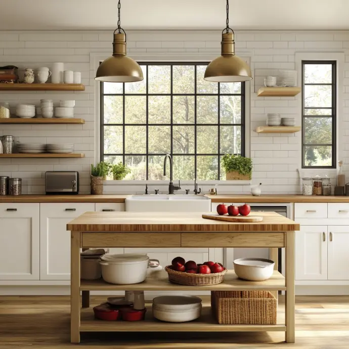 A modern farmhouse-style kitchen with a warm and inviting ambiance, featuring rectangular, narrow windows that bring in plenty of natural light.