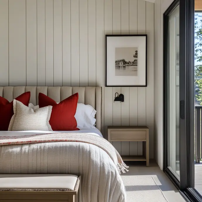 A modern farmhouse-style bedroom with a neutral color palette and subtle red accents. The bed features a beige upholstered headboard, crisp white linens, and decorative pillows in deep red and cream tones.