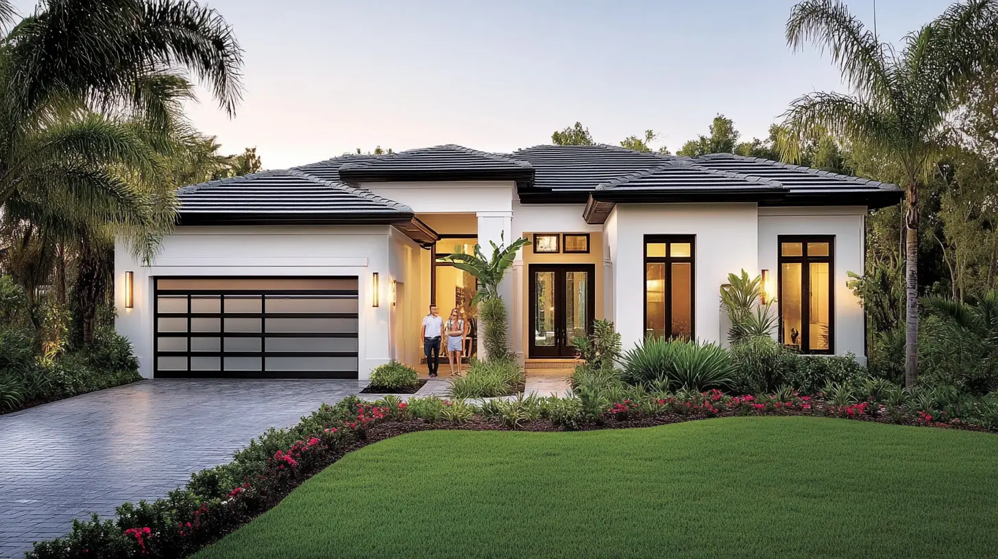 This modern Florida home features a sleek, contemporary design with clean lines, a spacious two-car garage, and lush tropical landscaping. Its elegant entryway is framed by large windows and a bold, dark-stained door, perfect for welcoming natural light.