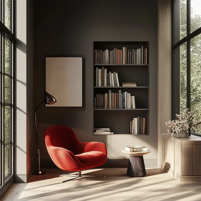 A minimalist yet inviting reading nook with a contemporary farmhouse feel.