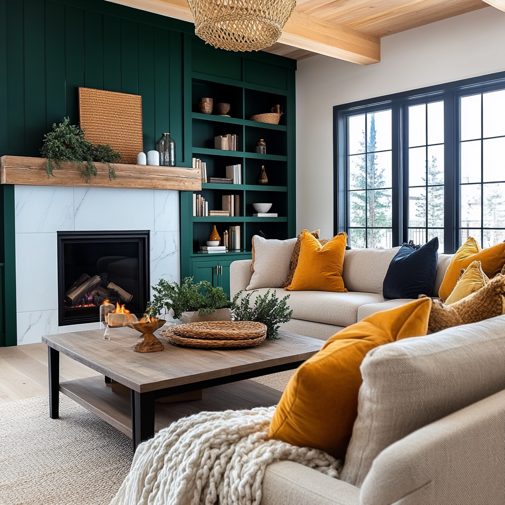 A living room with a high vaulted ceiling and exposed wooden beams. A tall stone fireplace with a wooden mantel serves as the focal point, adding warmth and texture. The seating area features emerald green velvet sofas paired with mustard yellow accent chairs, creating a bold yet elegant color contrast.