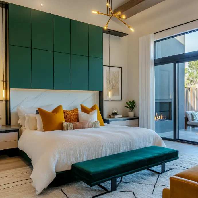A modern bedroom with a luxurious design. The room features a large bed with a white and marble-patterned headboard, adorned with mustard-colored pillows and a matching throw blanket.