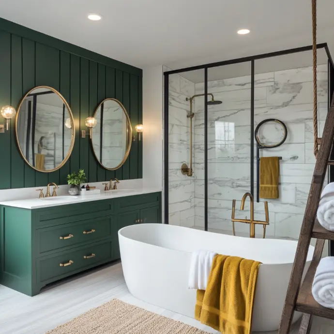 A luxurious bathroom with a sophisticated design. The space features deep green cabinetry with gold hardware, a white marble countertop, and vessel sinks.