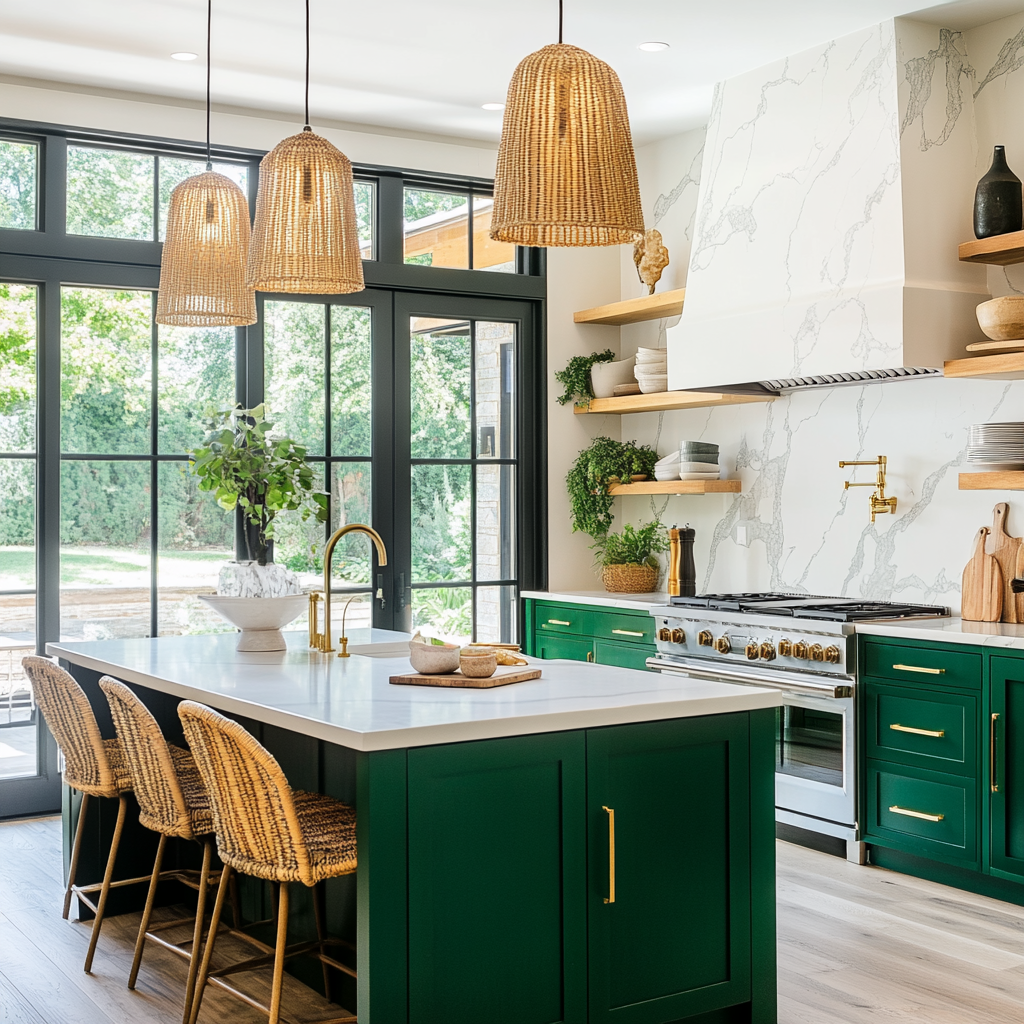 A modern farmhouse kitchen with deep emerald green shaker cabinets accented by gold hardware. A large white quartz island with a waterfall edge serves as the centerpiece, surrounded by woven rattan barstools. Above the island, three oversized rattan pendant lights add warmth and texture.