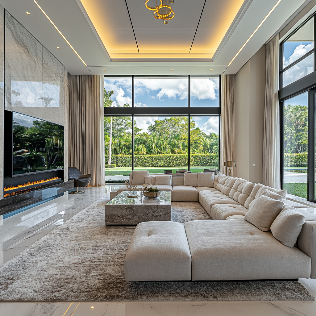 A stylish living room featuring a sleek entertainment wall, elegant furnishings, and warm lighting. Perfect for relaxation and entertaining in a modern, inviting space.