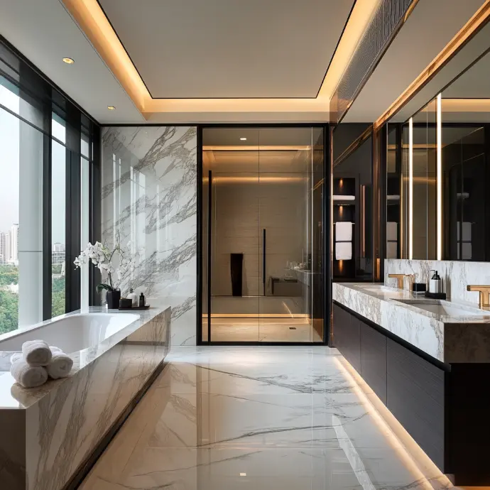 This luxurious modern bathroom features sleek white marble with bold veining, extending across the floors, walls, and bathtub surround for a seamless, elegant look.