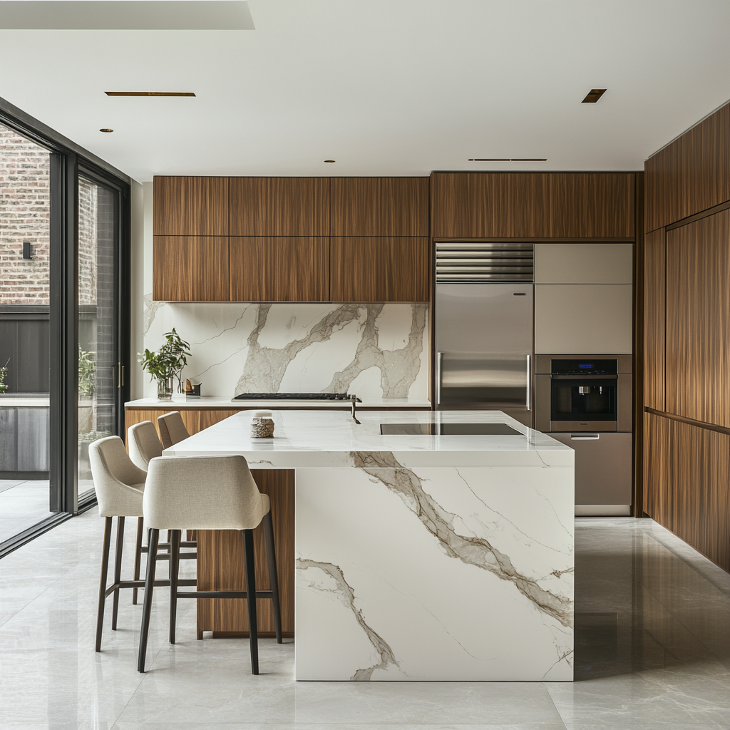 This modern kitchen features a sleek marble island with elegant veining, complemented by matching backsplash and countertops. The warm wood cabinetry contrasts beautifully with the stainless steel appliances, including a built-in refrigerator and coffee machine. Large floor-to-ceiling windows bring in natural light, creating an open and airy feel.