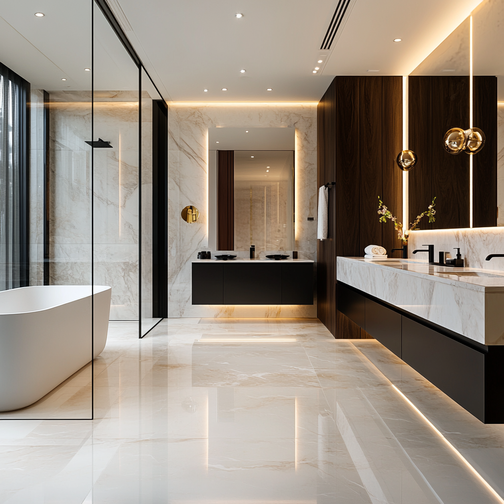 This luxurious modern bathroom features polished marble floors and walls, accented by dark wood cabinetry for a rich contrast. A freestanding white bathtub adds elegance, while the glass-enclosed rainfall shower enhances the spacious, airy feel.