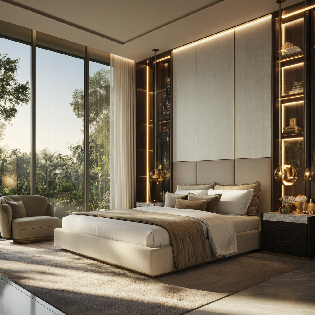 This luxurious bedroom features floor-to-ceiling windows, allowing natural light to flood the space and providing a serene view of lush greenery. A plush upholstered bed with elegant linens and decorative pillows sits against a tall, textured headboard, flanked by built-in illuminated shelving and stylish pendant lights.