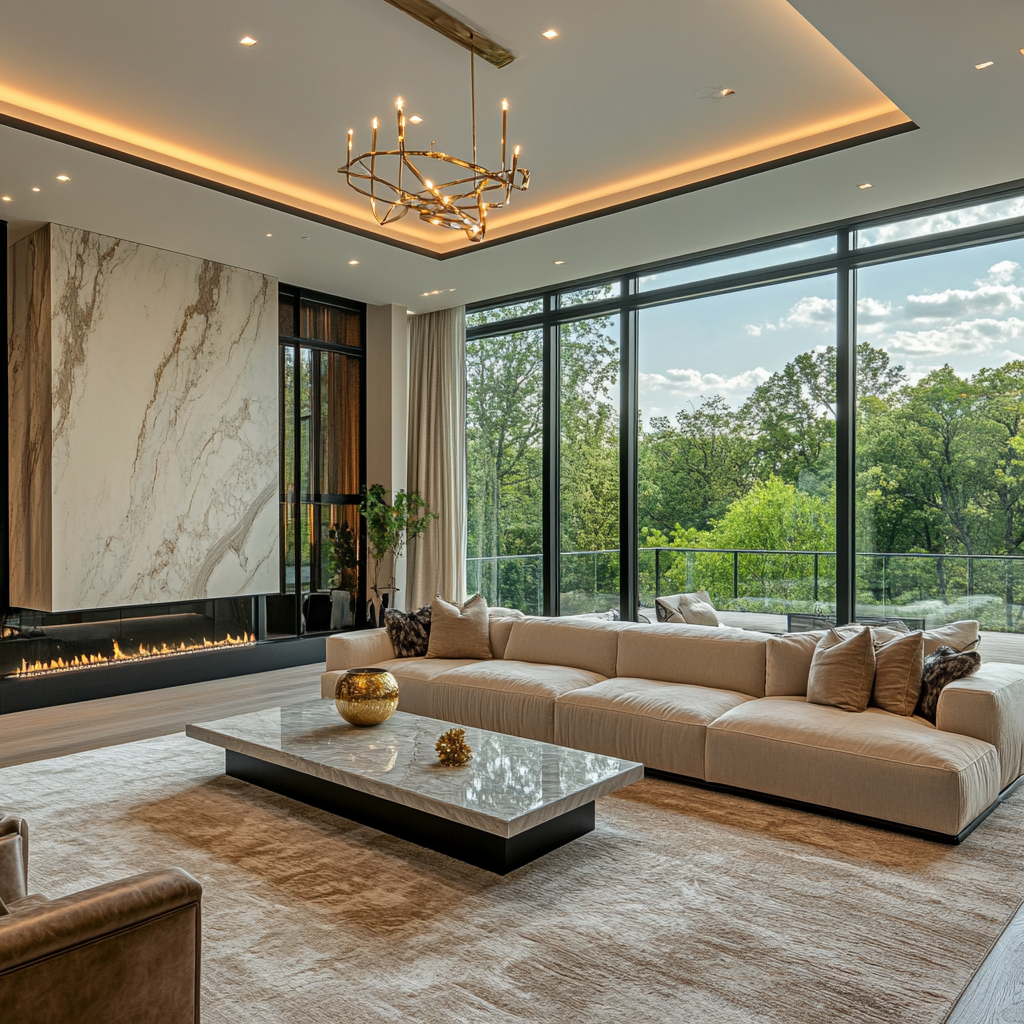 This elegant living room features floor-to-ceiling windows, offering a breathtaking view of lush greenery. A large beige sectional sofa provides a cozy and inviting atmosphere, complemented by a sleek marble coffee table.