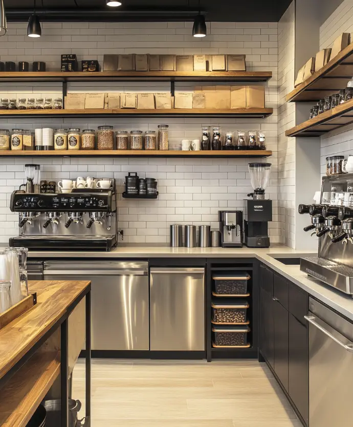 Professional café kitchen with a modern and functional design, optimized for efficiency and cleanliness. Stainless steel countertops, cabinets, and appliances dominate the space, ensuring a sleek and hygienic environment.