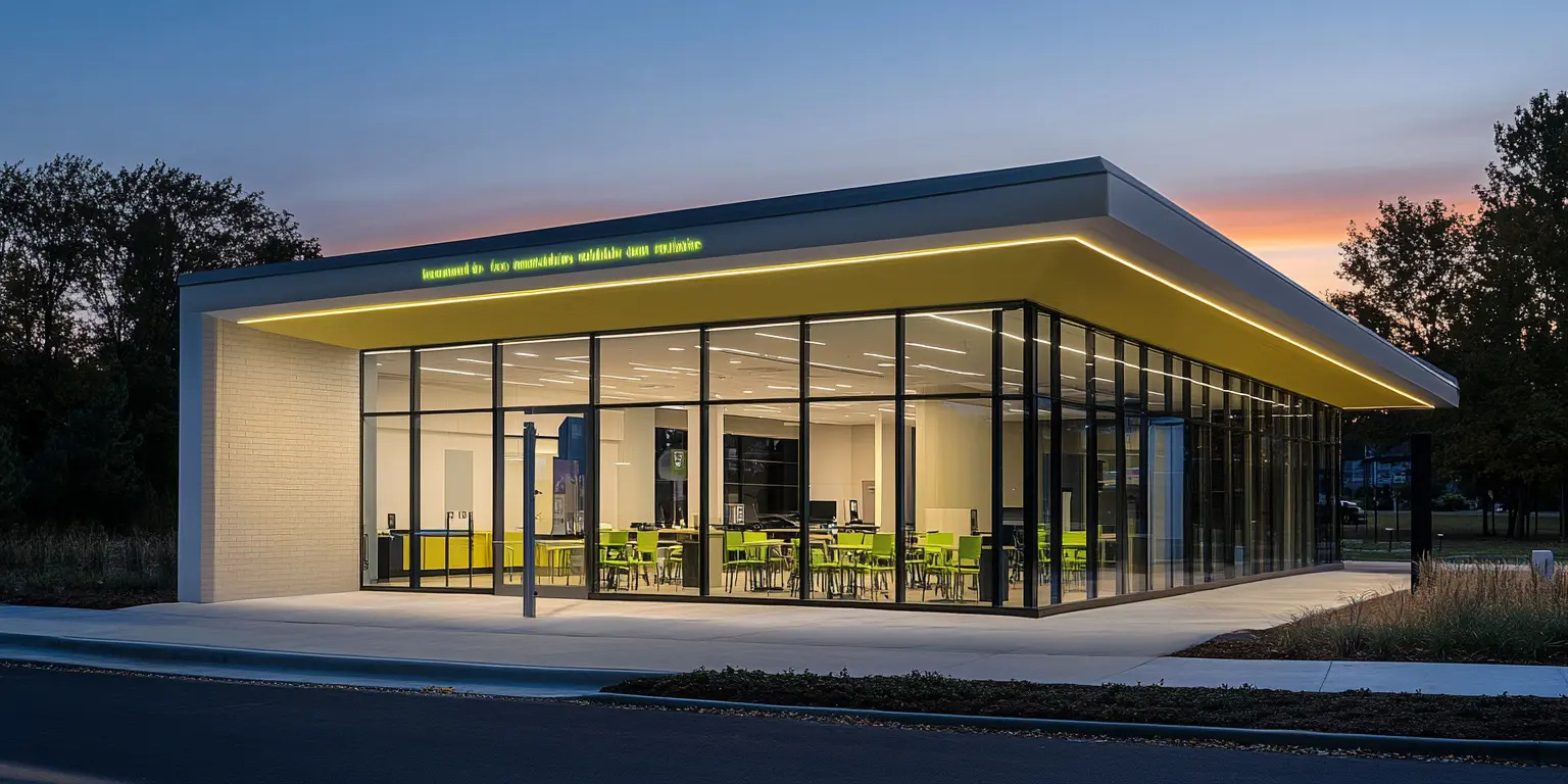 A modern and elegant café exterior at sunset, featuring a sleek and minimalist architectural design. The façade is composed of floor-to-ceiling glass windows framed with slim black metal borders, allowing warm golden light to illuminate the interior.