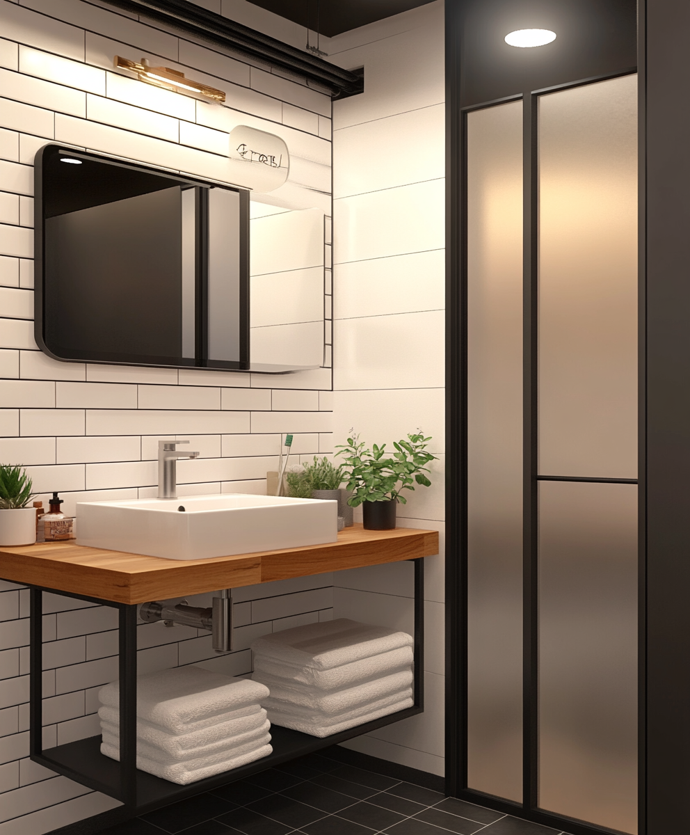 A modern café bathroom with a sleek and professional design. The space features white tiled walls, black accents, and soft wooden elements, creating a clean and inviting atmosphere.