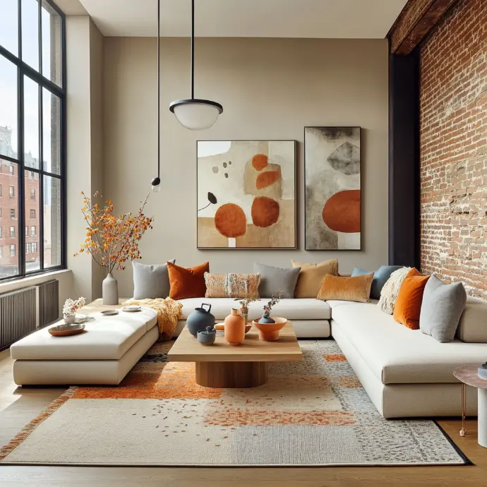 A spacious living room with a modern minimalist design, featuring a large modular sofa in neutral tones like beige and light gray, accented with throw pillows in burnt orange, terracotta, and soft dusty blue for contrast.