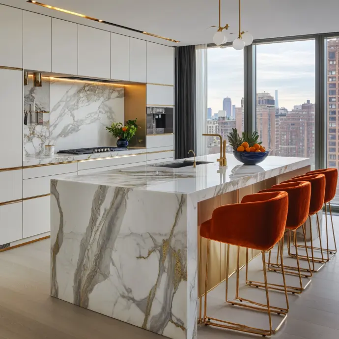 A sleek, high-end kitchen with custom cabinetry in matte white paired with gold hardware. The countertops and backsplash feature stunning Calacatta marble with subtle balck veining, while the central island boasts a waterfall edge and integrated storage.