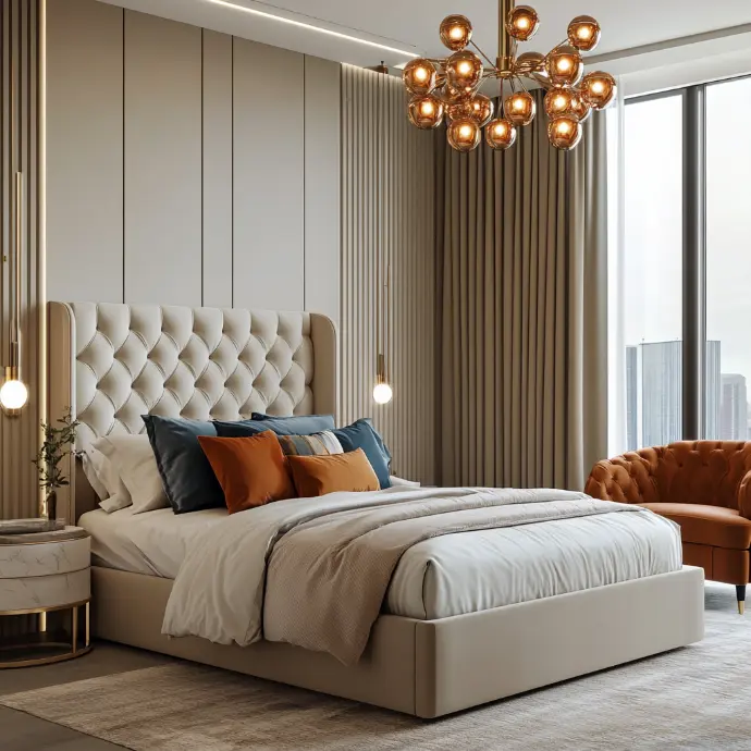 A tranquil yet opulent bedroom featuring a king-size bed with a tall, tufted velvet headboard in a rich beige tone.