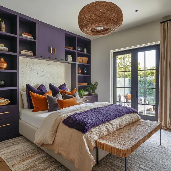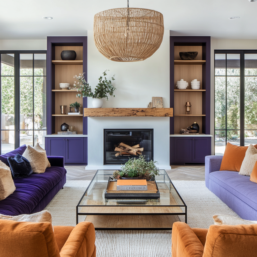 A spacious modern farmhouse living room with deep violet cabinetry flanking a white plaster fireplace with natural wood slats for texture.