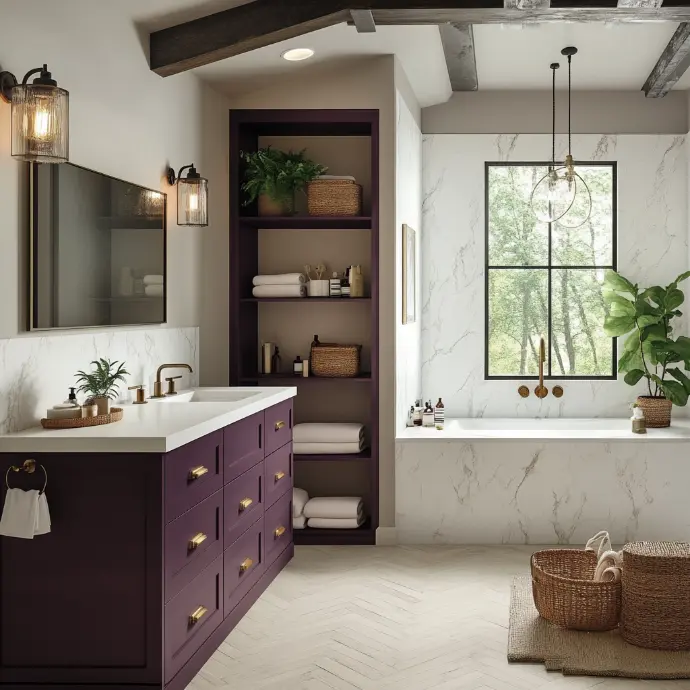 A luxurious modern farmhouse bathroom with bold cabinetry in a deep, rich dark violet, accented by sleek brushed gold hardware.