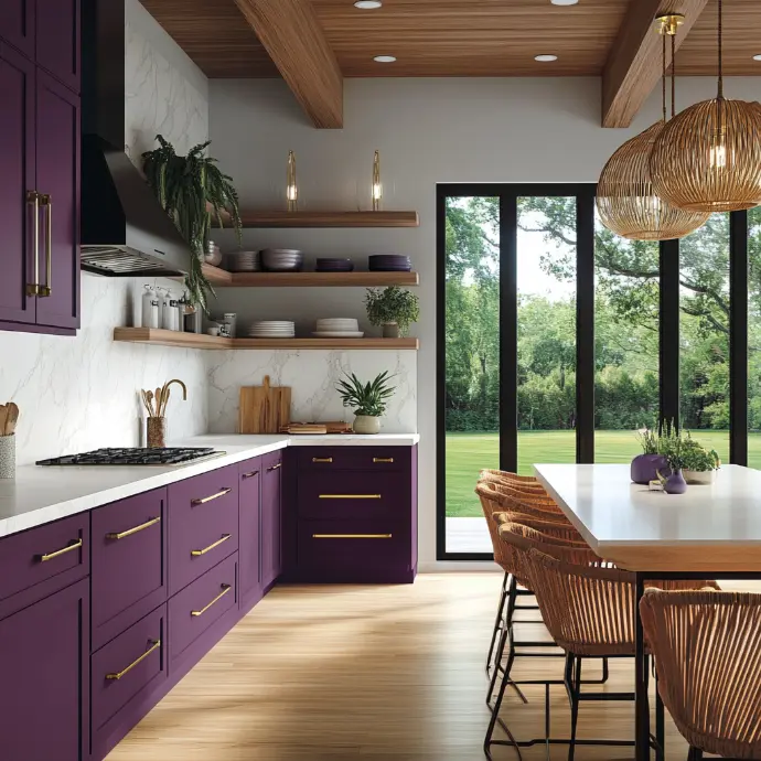 A vibrant modern farmhouse kitchen with bold, colorful cabinetry in a mix of dark violet color, rich and luxurious, accented by sleek brushed gold hardware. The space features a full-height sleek white marble backsplash with subtle gold and gray veining, adding a touch of elegance.