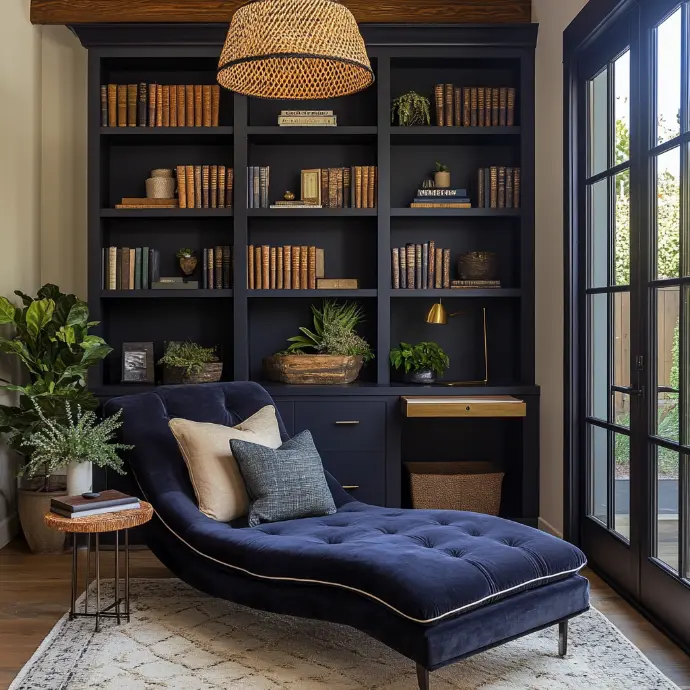 A modern farmhouse library and relaxation room with bold dark violet built-in bookcases featuring sleek brushed gold hardware.