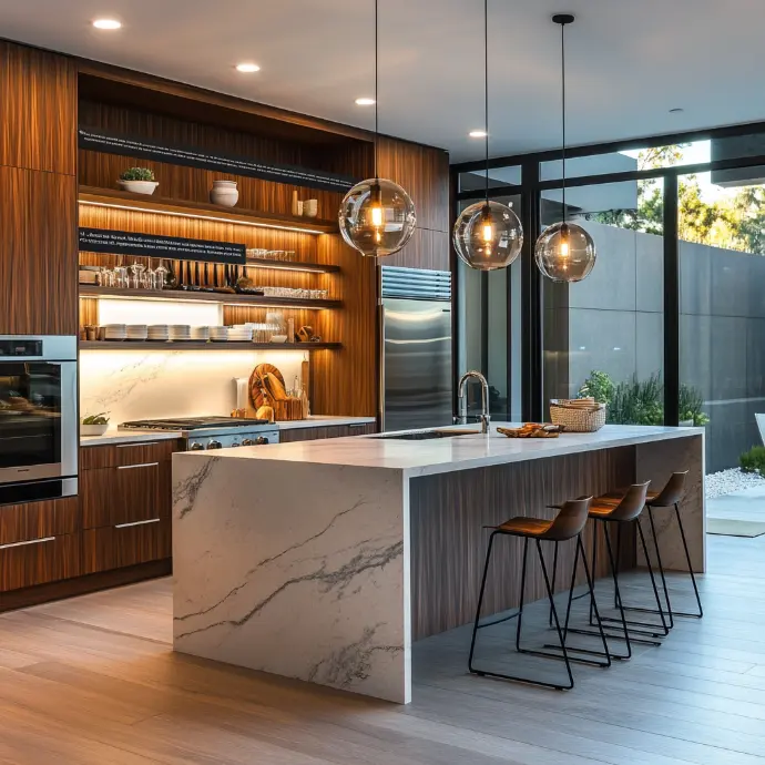 A modern kitchen with high-quality materials and meticulous attention to detail. A large central island made of quartz or marble serves as the focal point of the space, perfect for food preparation or casual gatherings, with sleek modern stools around it.