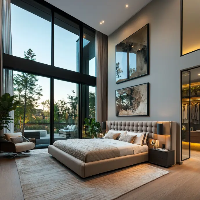This luxurious bedroom features floor-to-ceiling windows, allowing natural light to flood the space and providing a serene view of lush greenery. A plush upholstered bed with elegant linens and decorative pillows sits against a tall, textured headboard, flanked by built-in illuminated shelving and stylish pendant lights.