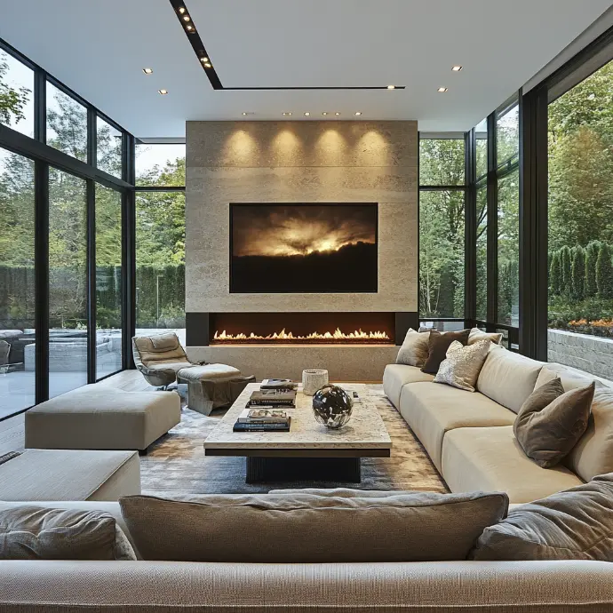 This elegant living room features floor-to-ceiling windows, offering a breathtaking view of lush greenery. A large beige sectional sofa provides a cozy and inviting atmosphere, complemented by a sleek marble coffee table.