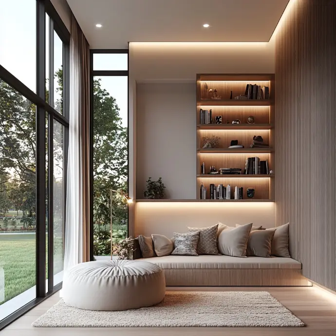 A cozy and modern reading nook with an inviting atmosphere. Large windows bring in natural light and offer peaceful views of greenery.