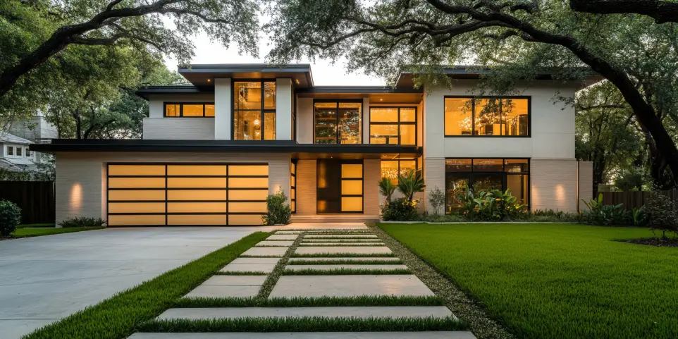This modern Florida home features a sleek, contemporary design with clean lines, a spacious two-car garage, and lush tropical landscaping. Its elegant entryway is framed by large windows and a bold, dark-stained door, perfect for welcoming natural light.